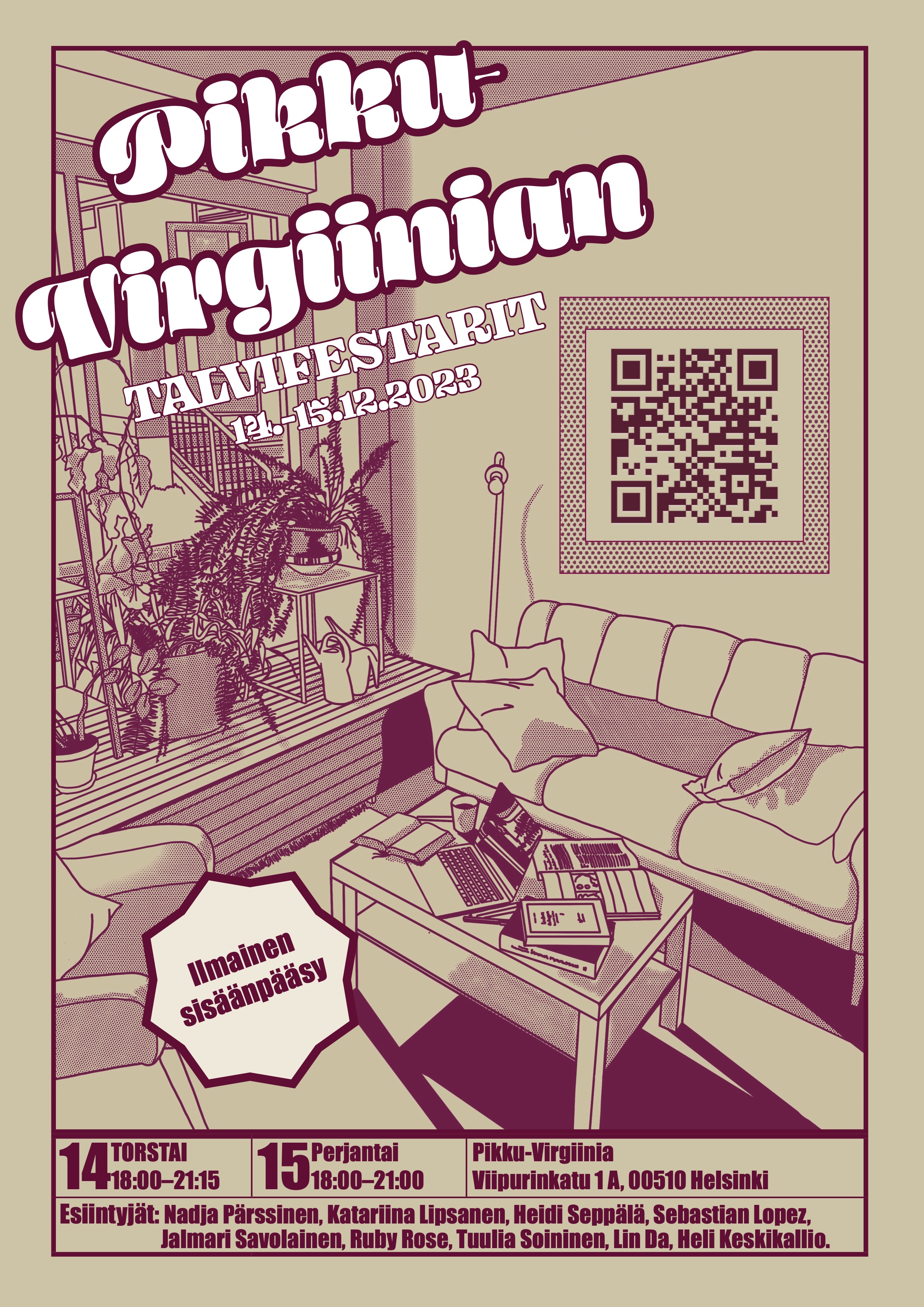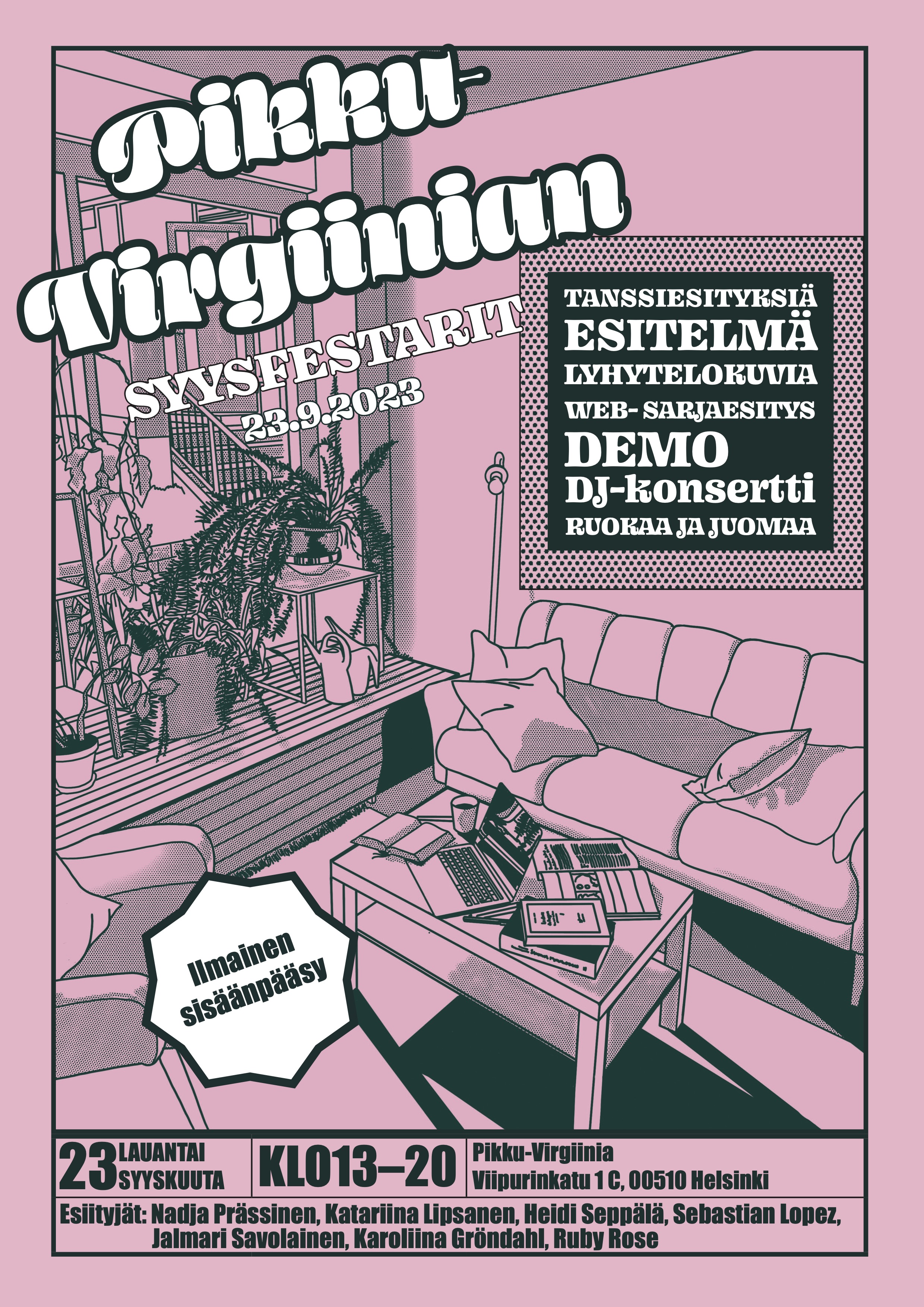 7/2023Graphicl design A poster for the fall festival of Pikku-Virgiinia, a workspace community located in Alppila, Helsinki. Pikku-Virgiinia is a community for creative professionals, and the purpose of its festival is to showcase the work of its members. The festival takes place at the workspace itself; the poster reflects the warm spirit of the workspace and its community. The chosen style is a retro-inspired design that mimics the halftone technique popular in the 1980s.